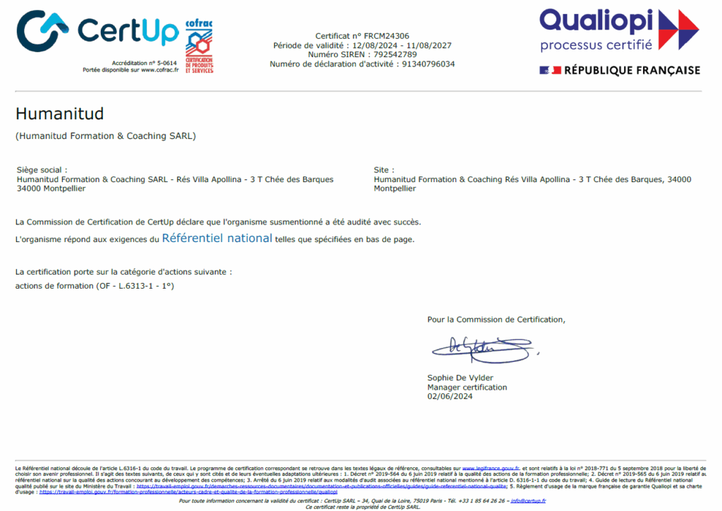 CERTIFICAT DE CONFORMITÉ QUALIOPI POUR ACTION DE FORMATION :